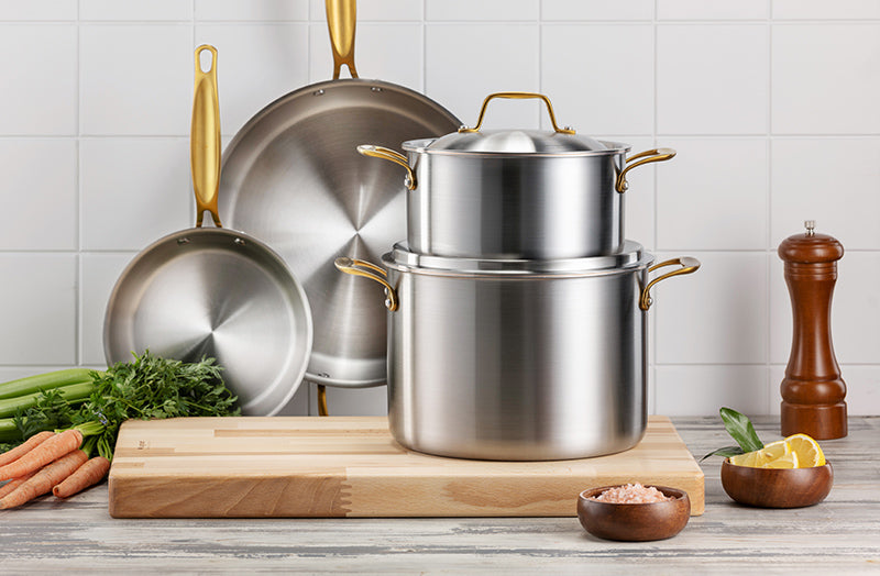 This collection is made of 304 stainless steel, aluminum, and 430 magnetic steel—all wrapped around a thick copper core